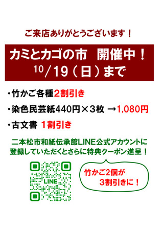 毎年恒例”カゴとカミの市”開催中! LINE会員もそうでない方もお得な セール期間となっております。 この機会にぜひ和紙伝承館まで 足をお運びください。
