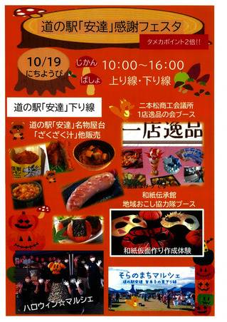 10月19日(日)に 道の駅「安達」上り線・下り線にて 年に1度の感謝フェスタを開催します。1日限りのお客様へのサービス企画を(数に限りがございますが・・)ご準備してお待ちしております。 是非お越しください💛