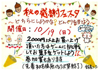 秋の感謝フェスタ 10/19(日)開催 ~どちらにしようかな?どんぐりを当てよう~ 2,000円以上、お買い上の方に紙コップゲームに参加して いただき、当たりが出たら地元の秋のお菓子プレゼント! 参加賞もあります☆ (先着30名様、無くなり次第終了です)