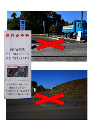 下り線から上り線への道路が11月12日(水)と11月14日(金)の2日間 工事のため通行止めとなります。大変ご迷惑をおかけしますが、迂回のご協力をよろしくお願いいたします。