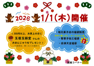 2026/1/1(木)開催 ・1,000以上、お買上の方に玉屋玉振堂さんのおまじゅうをプレゼント! (50個限定、無くなり次第終了) ・地元菓子店の福袋 ・手作り蒸しぱんが人気の智恵子加工の福袋 ・お味噌といったら、会津天宝福袋 などなど 他、限定販売もたくさんご用意しております。