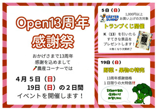 オープン13周年の感謝イベント開催!! 4月5日(日)トランプくじ開催 当日1,000円以上農産コーナーをご利用のお客様対象 K(13)を引いたらすてきな景品プレゼント♪(※無くなり次第終了) 4月19日(日)野菜・果物の特売開催! 13周年感謝価格 1日限定の大特価!! ご来店お待ちしております!(^^)!